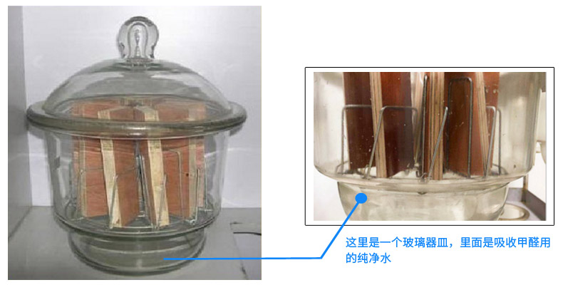 你看看上面那張表,表中的《人造板及其制品用甲醛清除劑清除能力的測(cè)試方法》,這個(gè)方法是檢測(cè)人造板甲醛釋放量方法,專業(yè)上稱之為“干燥器法”。就是把10塊切割成15cm×5cm的人造板,放到這個(gè)10升的玻璃容器里,密閉24小時(shí)。24小時(shí)中,人造板不停地釋放甲醛,在玻璃容器的底部,放著一個(gè)盛著純凈水的玻璃器皿,人造板釋放出來(lái)的甲醛被吸收在水中,然后檢測(cè)水中的甲醛,所得數(shù)值就是人造板甲醛釋放量。