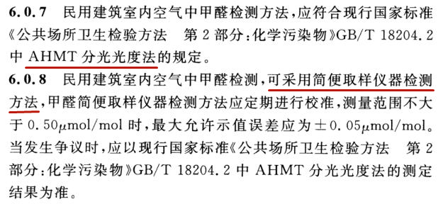 甲醛檢測(cè)允許使用經(jīng)過(guò)定期校準(zhǔn)的便攜式檢測(cè)儀進(jìn)行檢測(cè),當(dāng)發(fā)生爭(zhēng)議時(shí),應(yīng)以現(xiàn)行國(guó)家標(biāo)準(zhǔn)GB/T18204.2中AHMT分光光度法的測(cè)定結(jié)果為準(zhǔn)。