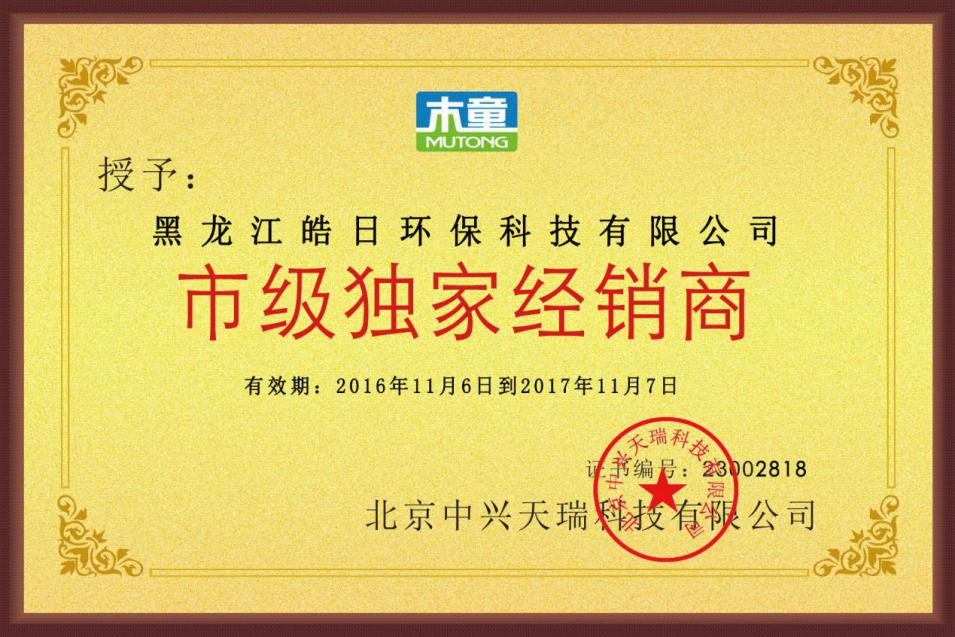 木童除甲醛產(chǎn)品市級(jí)獨(dú)家經(jīng)銷商證書