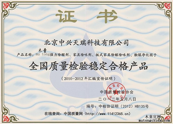 木童除甲醛、除味產(chǎn)品質(zhì)量合格證書